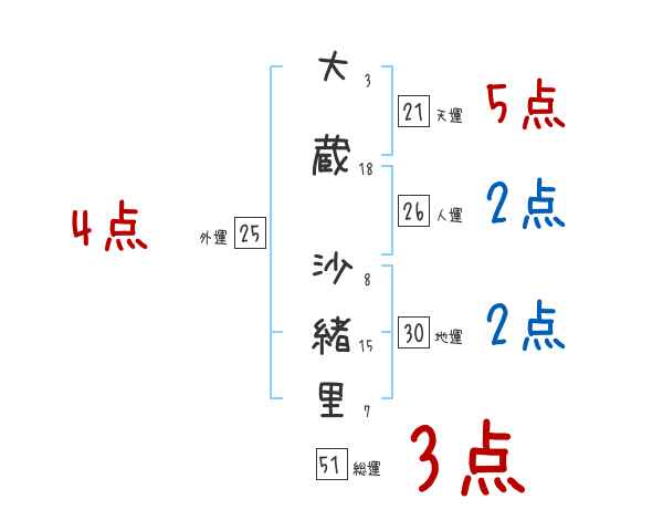 天運![]() | 大蔵沙緒里さんの天運は21画の5つ星!統率力がある。独立し成功する。名誉を手に入れる。 家系が持つ宿命的な運勢を表します。祖先から受け継いだ苗字ですので自分の力が及びません。家柄を象徴します。 |