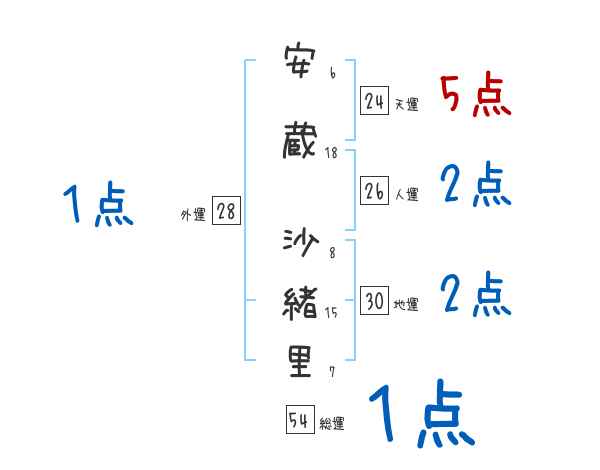 天運![]() | 安蔵沙緒里さんの天運は24画の5つ星!家庭運が良く順調な人生。金運にも恵まれる。 家系が持つ宿命的な運勢を表します。祖先から受け継いだ苗字ですので自分の力が及びません。家柄を象徴します。 |