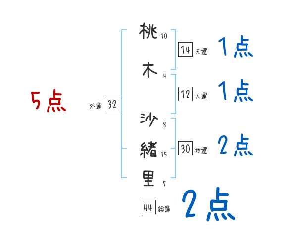 外運![]() | 桃木沙緒里さんの外運は32画の5つ星!柔軟性があり成功する。チャンスが多く金運が良い。 生活面を象徴する運勢です。外部から受ける影響力を表し、結婚運、家庭運や職場、環境への順応性を表します。 |
