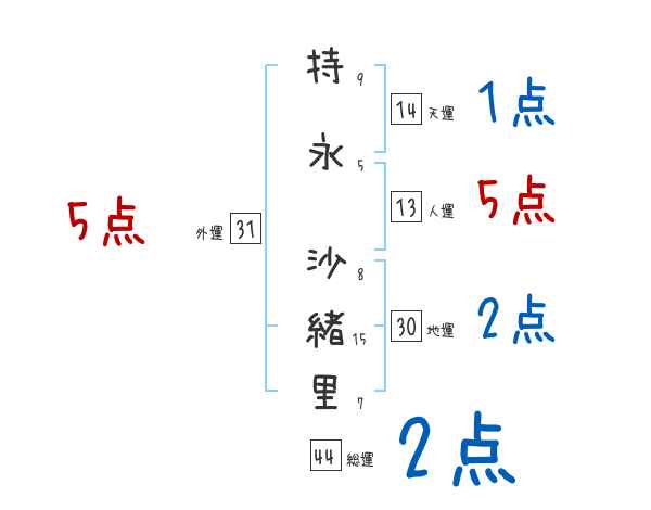 外運![]() | 持永沙緒里さんの外運は31画の5つ星!社交性があり判断力に優れる。順風満帆な人生で円満な生活。 生活面を象徴する運勢です。外部から受ける影響力を表し、結婚運、家庭運や職場、環境への順応性を表します。 |