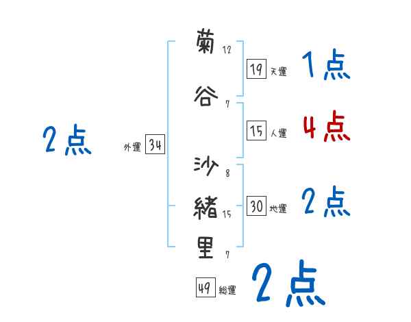 天運![]() | 菊谷沙緒里さんの天運は19画の1つ星!優れた才能を持ちますが、協調性が足りないことも。周りの人と協力する事を意識しましょう。 家系が持つ宿命的な運勢を表します。祖先から受け継いだ苗字ですので自分の力が及びません。家柄を象徴します。 |