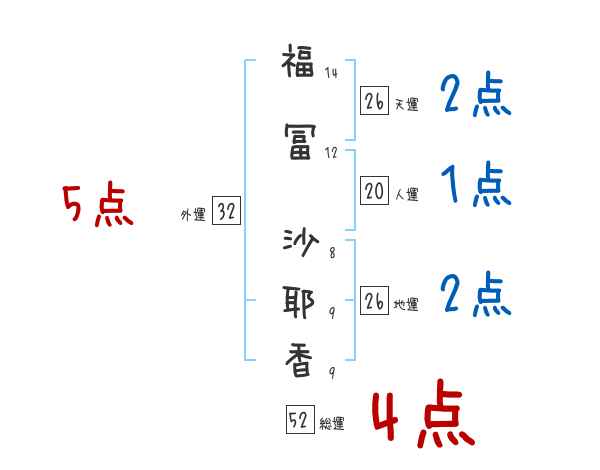 外運![]() | 福冨沙耶香さんの外運は32画の5つ星!柔軟性があり成功する。チャンスが多く金運が良い。 生活面を象徴する運勢です。外部から受ける影響力を表し、結婚運、家庭運や職場、環境への順応性を表します。 |