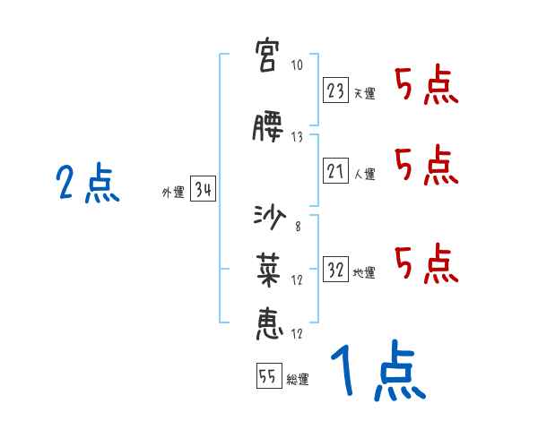 天運![]() | 宮腰沙菜恵さんの天運は23画の5つ星!想像力に優れ活力がある。一代で成功し名誉を手に入れる。 家系が持つ宿命的な運勢を表します。祖先から受け継いだ苗字ですので自分の力が及びません。家柄を象徴します。 |