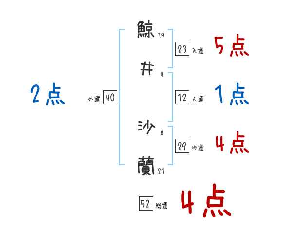 天運![]() | 鯨井沙蘭さんの天運は23画の5つ星!想像力に優れ活力がある。一代で成功し名誉を手に入れる。 家系が持つ宿命的な運勢を表します。祖先から受け継いだ苗字ですので自分の力が及びません。家柄を象徴します。 |