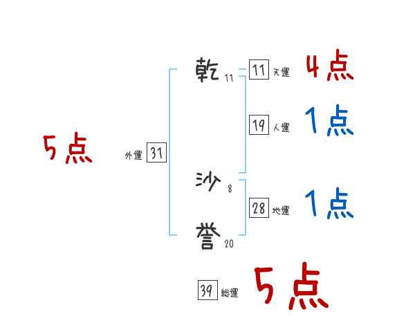 天運![]() | 乾沙誉さんの天運は11画の4つ星!着実に富や地位を得る幸運な人生。 家系が持つ宿命的な運勢を表します。祖先から受け継いだ苗字ですので自分の力が及びません。家柄を象徴します。 |