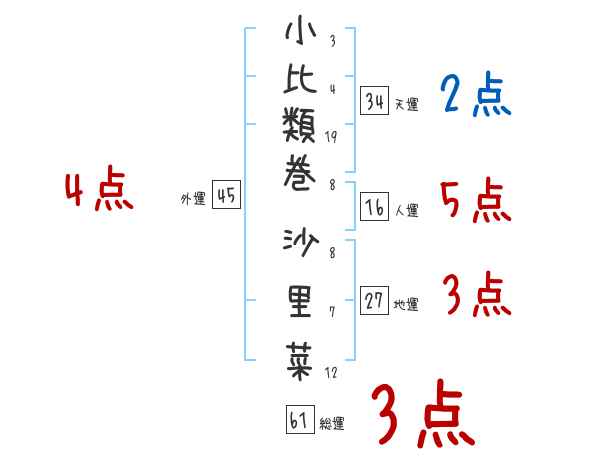 外運![]() | 小比類巻沙里菜さんの外運は45画の4つ星!もくもくと物事を進め達成する。地味な努力家。 生活面を象徴する運勢です。外部から受ける影響力を表し、結婚運、家庭運や職場、環境への順応性を表します。 |