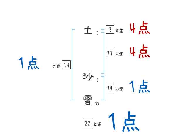 天運![]() | 土沙雪さんの天運は3画の4つ星!活動的で才能に恵まれ、多くの信頼を得る。希望に満ち成長する。 家系が持つ宿命的な運勢を表します。祖先から受け継いだ苗字ですので自分の力が及びません。家柄を象徴します。 |