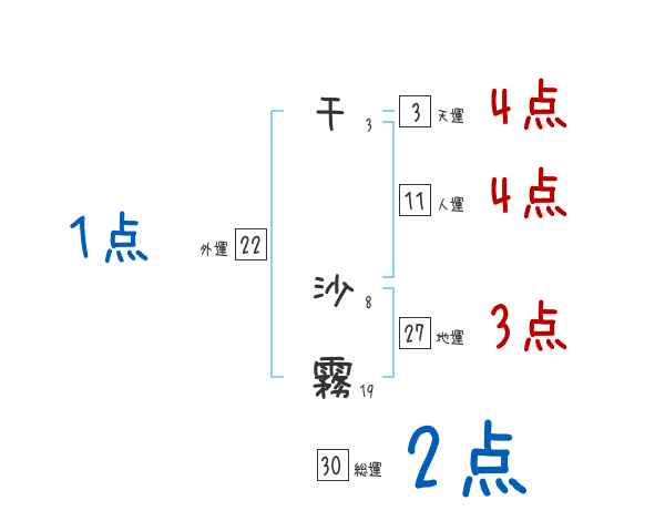 天運![]() | 千沙霧さんの天運は3画の4つ星!活動的で才能に恵まれ、多くの信頼を得る。希望に満ち成長する。 家系が持つ宿命的な運勢を表します。祖先から受け継いだ苗字ですので自分の力が及びません。家柄を象徴します。 |