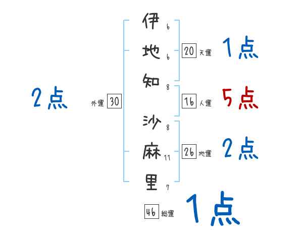 地運![]() | 伊地知沙麻里さんの地運は26画の2つ星!波瀾万丈かも。信頼できる人を大事にしましょう。 個性を表す基礎的な運勢です。性格形成や対人関係、行動力など家庭環境に影響されます。主に誕生してから20歳くらいまでの若年期の運勢を表します。 |