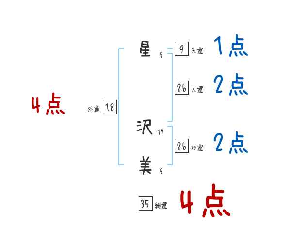 天運![]() | 星沢美さんの天運は9画の1つ星!消極的で才能を発揮することが苦手なことも。周りの意見に耳を傾けましょう。 家系が持つ宿命的な運勢を表します。祖先から受け継いだ苗字ですので自分の力が及びません。家柄を象徴します。 |