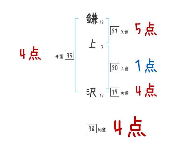 総運![]() | 鎌上沢さんの総運は38画の4つ星!温厚な性格で技術的な才能を発揮する。職人的な仕事に向いている。 あなたの人生を表す1番重要な運勢です。生涯を通じて影響する総合運となり、主に50歳以降の晩年期に影響を及ぼします。 |