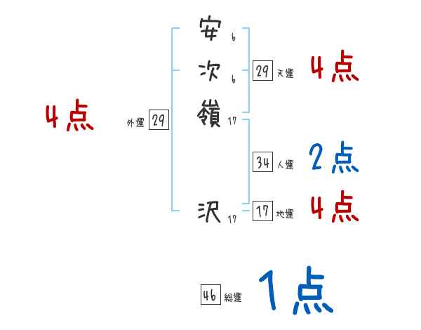 総運![]() | 安次嶺沢さんの総運は46画の1つ星!迷走することが多く苦労するかも。目先のことにとらわれないように。 あなたの人生を表す1番重要な運勢です。生涯を通じて影響する総合運となり、主に50歳以降の晩年期に影響を及ぼします。 |