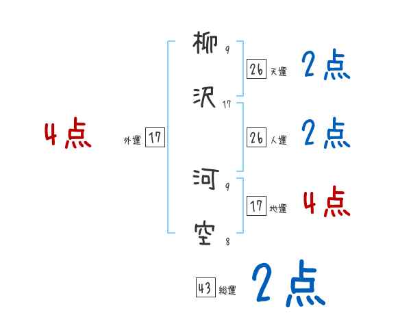天運![]() | 柳沢河空さんの天運は26画の2つ星!波瀾万丈かも。信頼できる人を大事にしましょう。 家系が持つ宿命的な運勢を表します。祖先から受け継いだ苗字ですので自分の力が及びません。家柄を象徴します。 |