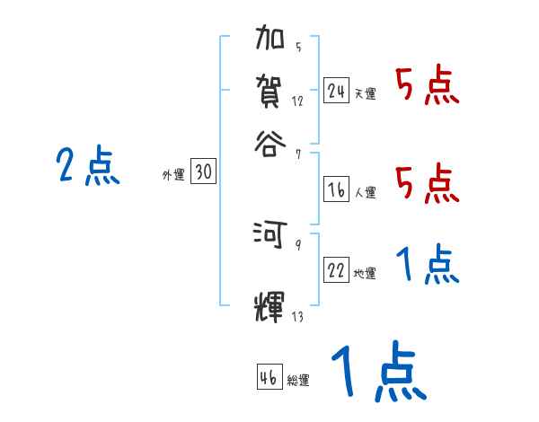 天運![]() | 加賀谷河輝さんの天運は24画の5つ星!家庭運が良く順調な人生。金運にも恵まれる。 家系が持つ宿命的な運勢を表します。祖先から受け継いだ苗字ですので自分の力が及びません。家柄を象徴します。 |