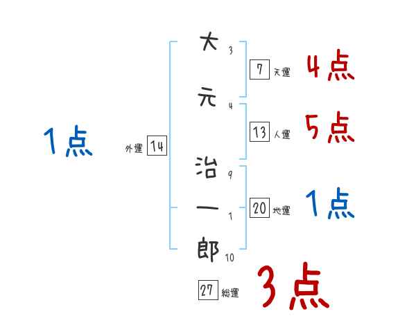 天運![]() | 大元治一郎さんの天運は7画の4つ星!強い意志や信念を持ち独立心が強い。自立する。 家系が持つ宿命的な運勢を表します。祖先から受け継いだ苗字ですので自分の力が及びません。家柄を象徴します。 |