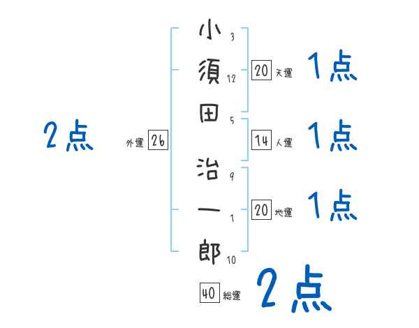 外運![]() | 小須田治一郎さんの外運は26画の2つ星!波瀾万丈かも。信頼できる人を大事にしましょう。 生活面を象徴する運勢です。外部から受ける影響力を表し、結婚運、家庭運や職場、環境への順応性を表します。 |