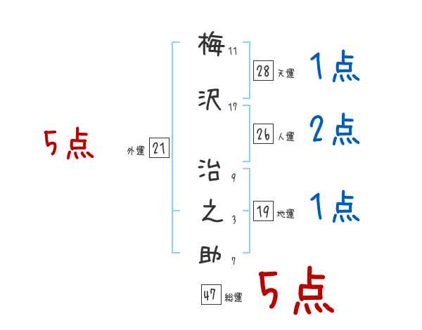 外運![]() | 梅沢治之助さんの外運は21画の5つ星!統率力がある。独立し成功する。名誉を手に入れる。 生活面を象徴する運勢です。外部から受ける影響力を表し、結婚運、家庭運や職場、環境への順応性を表します。 |
