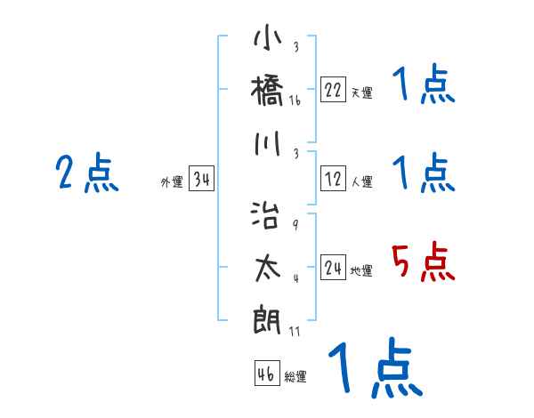 総運![]() | 小橋川治太朗さんの総運は46画の1つ星!迷走することが多く苦労するかも。目先のことにとらわれないように。 あなたの人生を表す1番重要な運勢です。生涯を通じて影響する総合運となり、主に50歳以降の晩年期に影響を及ぼします。 |