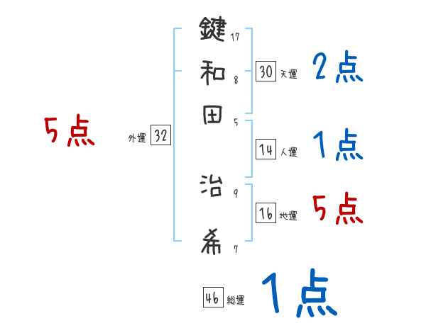 外運![]() | 鍵和田治希さんの外運は32画の5つ星!柔軟性があり成功する。チャンスが多く金運が良い。 生活面を象徴する運勢です。外部から受ける影響力を表し、結婚運、家庭運や職場、環境への順応性を表します。 |