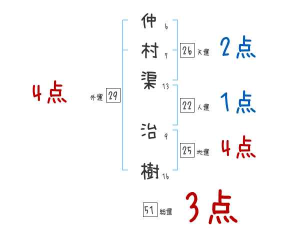 天運![]() | 仲村渠治樹さんの天運は26画の2つ星!波瀾万丈かも。信頼できる人を大事にしましょう。 家系が持つ宿命的な運勢を表します。祖先から受け継いだ苗字ですので自分の力が及びません。家柄を象徴します。 |