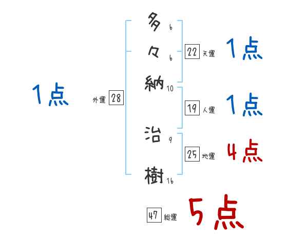 総運![]() | 多々納治樹さんの総運は47画の5つ星!実力が開花し発展する円満な人生。財に恵まれる。 あなたの人生を表す1番重要な運勢です。生涯を通じて影響する総合運となり、主に50歳以降の晩年期に影響を及ぼします。 |