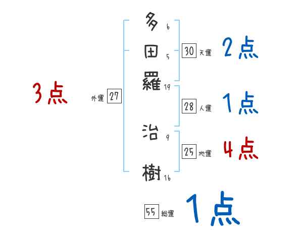 天運![]() | 多田羅治樹さんの天運は30画の2つ星!浮き沈みの激しさに注意しましょう。 家系が持つ宿命的な運勢を表します。祖先から受け継いだ苗字ですので自分の力が及びません。家柄を象徴します。 |
