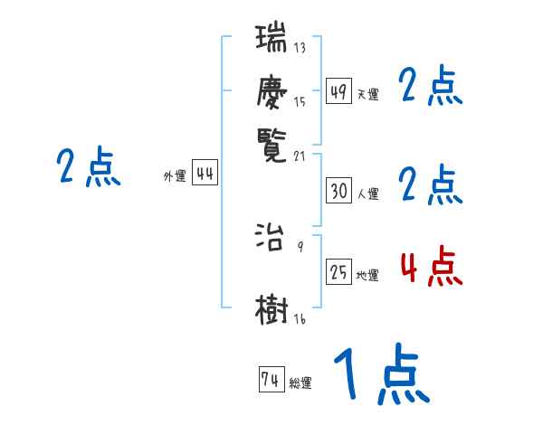 天運![]() | 瑞慶覧治樹さんの天運は49画の2つ星!不安定な性格で明暗がある人生。周りの人には支援されやすい。 家系が持つ宿命的な運勢を表します。祖先から受け継いだ苗字ですので自分の力が及びません。家柄を象徴します。 |