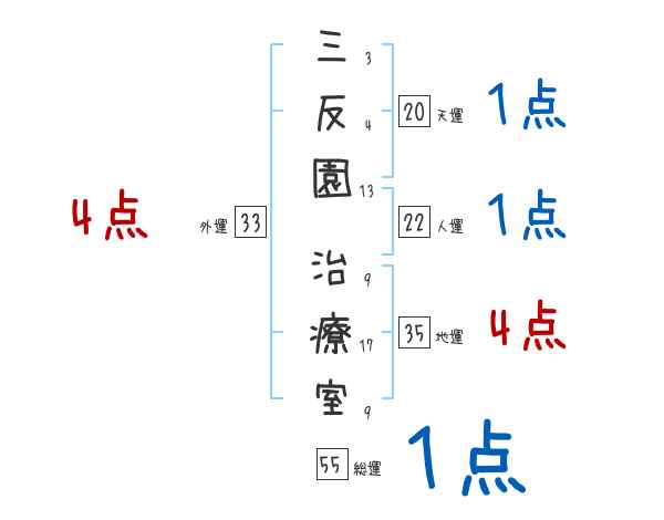 外運![]() | 三反園治療室さんの外運は33画の4つ星!権力志向でプライドが高い。勇気があり運を切り開き成功する。 生活面を象徴する運勢です。外部から受ける影響力を表し、結婚運、家庭運や職場、環境への順応性を表します。 |