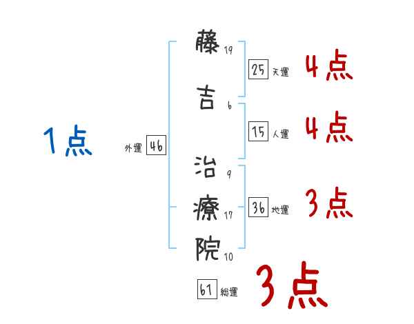 天運![]() | 藤吉治療院さんの天運は25画の4つ星!個性があり才能があふれる。強運の持ち主で発展する。 家系が持つ宿命的な運勢を表します。祖先から受け継いだ苗字ですので自分の力が及びません。家柄を象徴します。 |