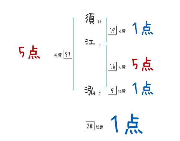 人運![]() | 須江泓さんの人運は16画の5つ星!人望が厚く大きく発展する。逆転成功が見える。 性格や才能などを表す2番目に重要な運勢です。人間関係や協調性、社会的な成功に影響します。主に20歳から50歳ぐらいまでの中年期の運勢を表します。 |
