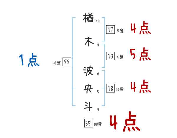 総運![]() | 楢木波央斗さんの総運は35画の4つ星!温厚な性格で感受性が高い。穏和な性格で人望が厚い。 あなたの人生を表す1番重要な運勢です。生涯を通じて影響する総合運となり、主に50歳以降の晩年期に影響を及ぼします。 |