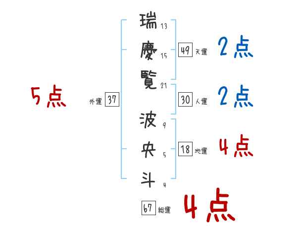 天運![]() | 瑞慶覧波央斗さんの天運は49画の2つ星!不安定な性格で明暗がある人生。周りの人には支援されやすい。 家系が持つ宿命的な運勢を表します。祖先から受け継いだ苗字ですので自分の力が及びません。家柄を象徴します。 |