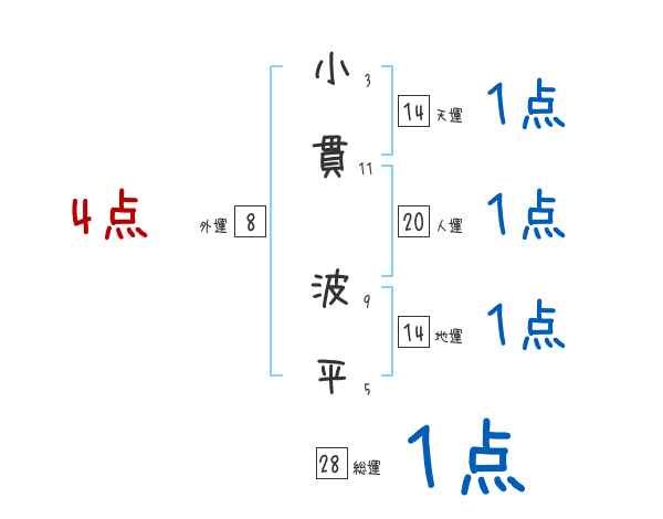 外運![]() | 小貫波平さんの外運は8画の4つ星!勤勉家。根気強く努力し成功する。忍耐力がある。 生活面を象徴する運勢です。外部から受ける影響力を表し、結婚運、家庭運や職場、環境への順応性を表します。 |