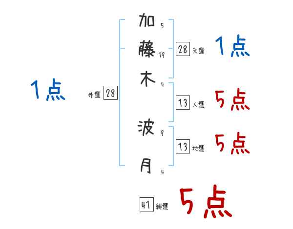 天運![]() | 加藤木波月さんの天運は28画の1つ星!家庭環境に注意。スポーツで活躍できる能力があるかも。 家系が持つ宿命的な運勢を表します。祖先から受け継いだ苗字ですので自分の力が及びません。家柄を象徴します。 |