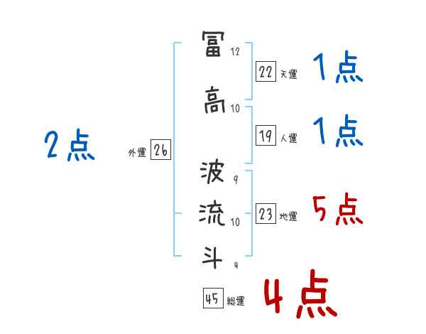 天運![]() | 冨高波流斗さんの天運は22画の1つ星!努力することが苦手ないっぽう手先が器用。芸術性にも優れる。 家系が持つ宿命的な運勢を表します。祖先から受け継いだ苗字ですので自分の力が及びません。家柄を象徴します。 |