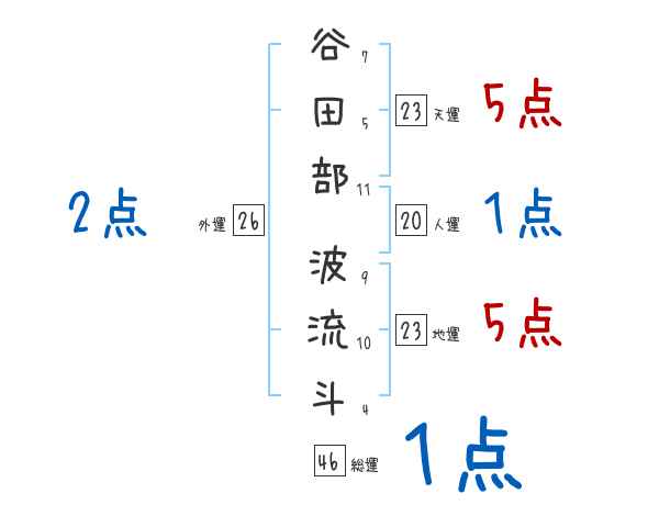 | 天運  | 谷田部波流斗さんの天運は23画の5つ星!想像力に優れ活力がある。一代で成功し名誉を手に入れる。家系が持つ宿命的な運勢を表します。祖先から受け継いだ苗字ですので自分の力が及びません。家柄を象徴します。 |