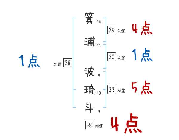 天運![]() | 箕浦波琉斗さんの天運は25画の4つ星!個性があり才能があふれる。強運の持ち主で発展する。 家系が持つ宿命的な運勢を表します。祖先から受け継いだ苗字ですので自分の力が及びません。家柄を象徴します。 |