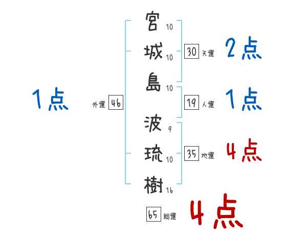 総運![]() | 宮城島波琉樹さんの総運は65画の4つ星!幸運に恵まれ繁栄する。包容力がある。 あなたの人生を表す1番重要な運勢です。生涯を通じて影響する総合運となり、主に50歳以降の晩年期に影響を及ぼします。 |
