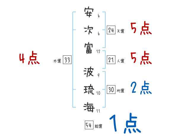 地運![]() | 安次富波琉海さんの地運は30画の2つ星!浮き沈みの激しさに注意しましょう。 個性を表す基礎的な運勢です。性格形成や対人関係、行動力など家庭環境に影響されます。主に誕生してから20歳くらいまでの若年期の運勢を表します。 |
