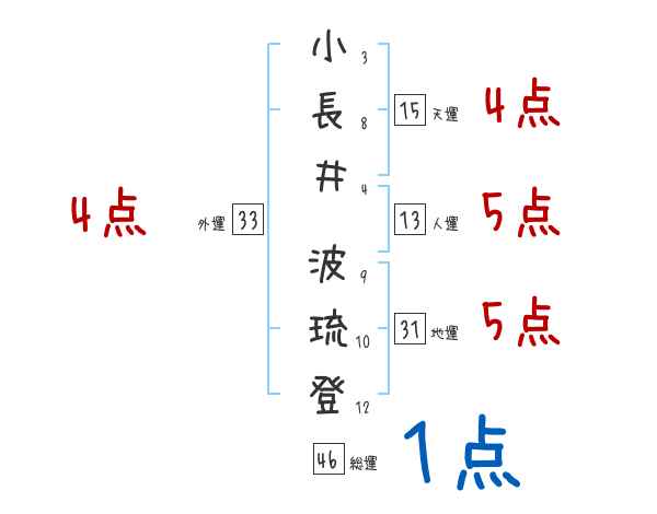 総運![]() | 小長井波琉登さんの総運は46画の1つ星!迷走することが多く苦労するかも。目先のことにとらわれないように。 あなたの人生を表す1番重要な運勢です。生涯を通じて影響する総合運となり、主に50歳以降の晩年期に影響を及ぼします。 |