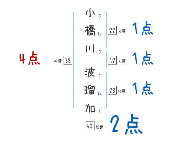 天運![]() | 小橋川波瑠加さんの天運は22画の1つ星!努力することが苦手ないっぽう手先が器用。芸術性にも優れる。 家系が持つ宿命的な運勢を表します。祖先から受け継いだ苗字ですので自分の力が及びません。家柄を象徴します。 |