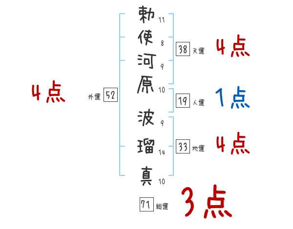 天運![]() | 勅使河原波瑠真さんの天運は38画の4つ星!温厚な性格で技術的な才能を発揮する。職人的な仕事に向いている。 家系が持つ宿命的な運勢を表します。祖先から受け継いだ苗字ですので自分の力が及びません。家柄を象徴します。 |