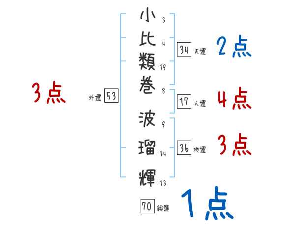 天運![]() | 小比類巻波瑠輝さんの天運は34画の2つ星!独創性に優れるが、自尊心が強く災難に注意しましょう。 家系が持つ宿命的な運勢を表します。祖先から受け継いだ苗字ですので自分の力が及びません。家柄を象徴します。 |
