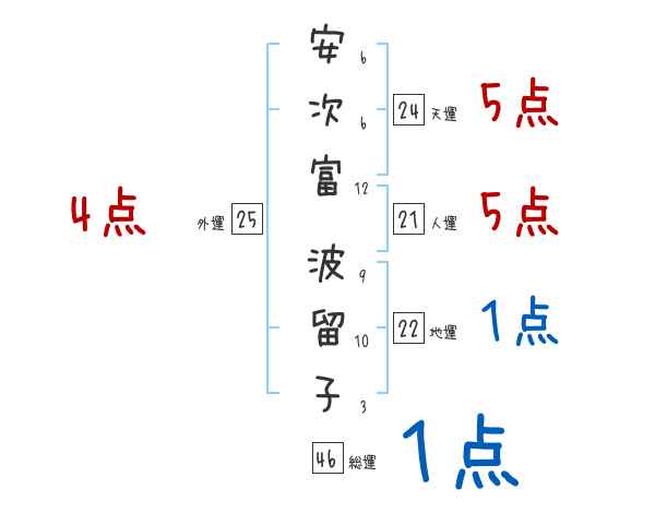 天運![]() | 安次富波留子さんの天運は24画の5つ星!家庭運が良く順調な人生。金運にも恵まれる。 家系が持つ宿命的な運勢を表します。祖先から受け継いだ苗字ですので自分の力が及びません。家柄を象徴します。 |