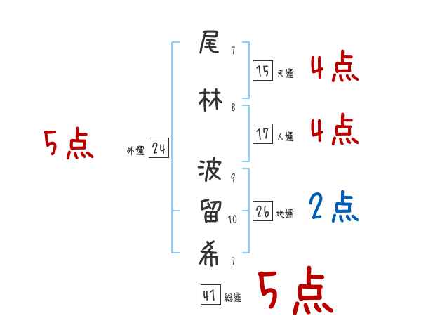 外運![]() | 尾林波留希さんの外運は24画の5つ星!家庭運が良く順調な人生。金運にも恵まれる。 生活面を象徴する運勢です。外部から受ける影響力を表し、結婚運、家庭運や職場、環境への順応性を表します。 |