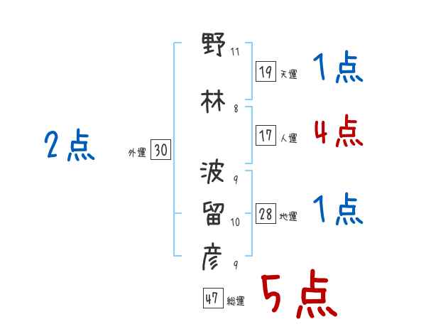 総運![]() | 野林波留彦さんの総運は47画の5つ星!実力が開花し発展する円満な人生。財に恵まれる。 あなたの人生を表す1番重要な運勢です。生涯を通じて影響する総合運となり、主に50歳以降の晩年期に影響を及ぼします。 |