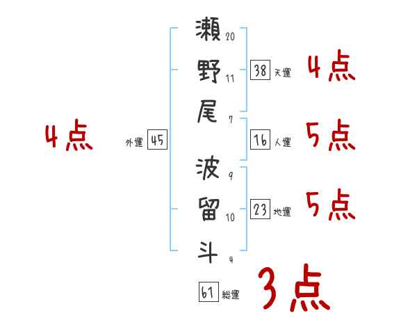 人運![]() | 瀬野尾波留斗さんの人運は16画の5つ星!人望が厚く大きく発展する。逆転成功が見える。 性格や才能などを表す2番目に重要な運勢です。人間関係や協調性、社会的な成功に影響します。主に20歳から50歳ぐらいまでの中年期の運勢を表します。 |