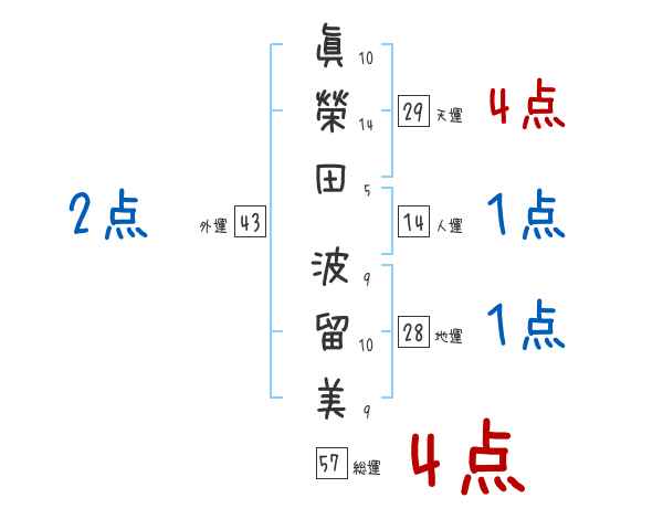 総運![]() | 眞榮田波留美さんの総運は57画の4つ星!向上心があり人望がある。地位を得る。 あなたの人生を表す1番重要な運勢です。生涯を通じて影響する総合運となり、主に50歳以降の晩年期に影響を及ぼします。 |