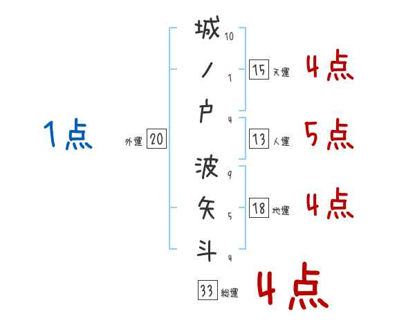 天運![]() | 城ノ戸波矢斗さんの天運は15画の4つ星!人徳があり出世する。順調に物事を進め円満な人生。 家系が持つ宿命的な運勢を表します。祖先から受け継いだ苗字ですので自分の力が及びません。家柄を象徴します。 |