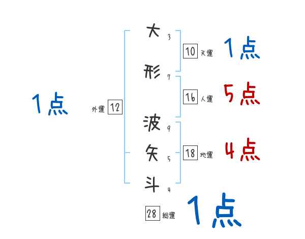 天運![]() | 大形波矢斗さんの天運は10画の1つ星!不安を感じやすい傾向。ストレスを抱えないように注意しましょう。 家系が持つ宿命的な運勢を表します。祖先から受け継いだ苗字ですので自分の力が及びません。家柄を象徴します。 |
